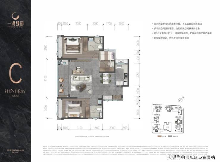 招商一湾臻邸115㎡4房2卫横厅宽敞,主卧套房舒适,约115平做4房空间尺度还行;