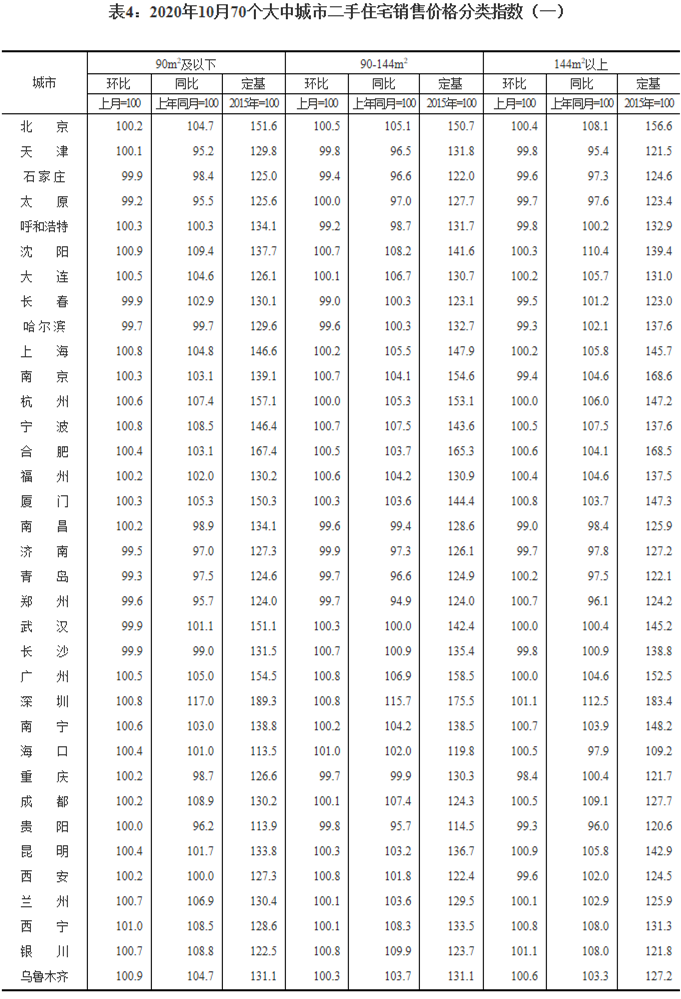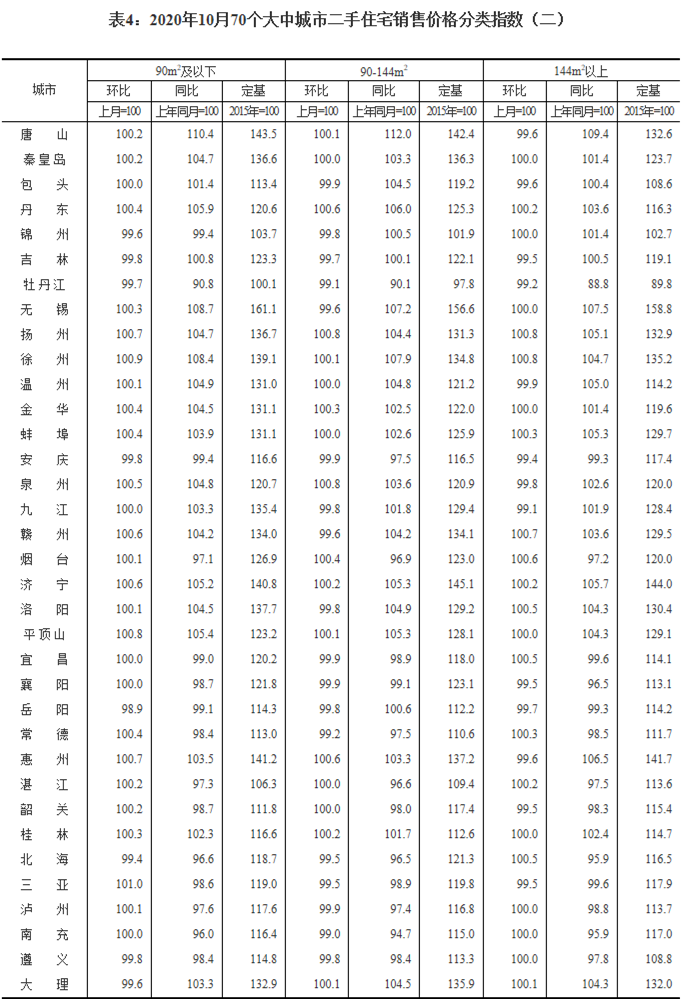 初步测算,10月份,一线城市新建商品住宅和二手住宅销售价格同比分别上涨4.1%和8.0%,涨幅比上月分别扩大0.2和0.6个百分点。二线城市新建商品住宅销售价格同比上涨4.4%,涨幅比上月回落0.4个百分点;二手住宅销售价格同比上涨2.1%,涨幅比上月微扩0.1个百分点。三线城市新建商品住宅和二手住宅销售价格同比分别上涨4.0%和1.5%,涨幅比上月分别回落0.4和0.2个百分点,均已连续19个月相同或回落。
