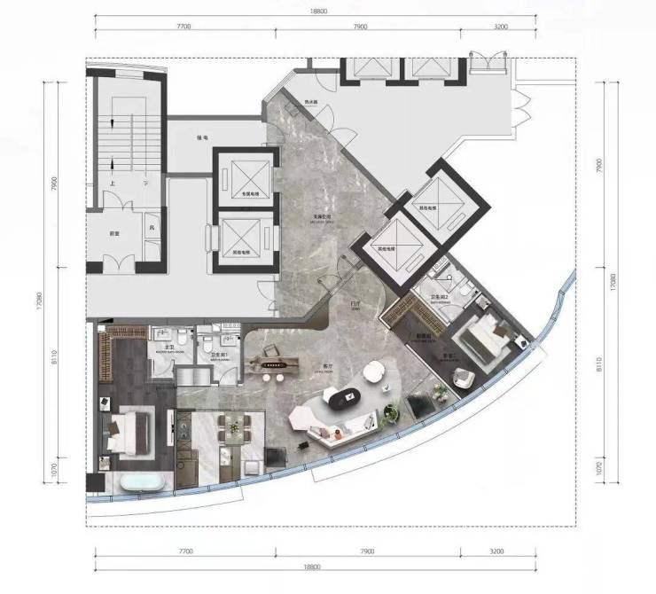 这个户型的设计虽然也是类似于游轮船头,但与A户型还是有点区别。