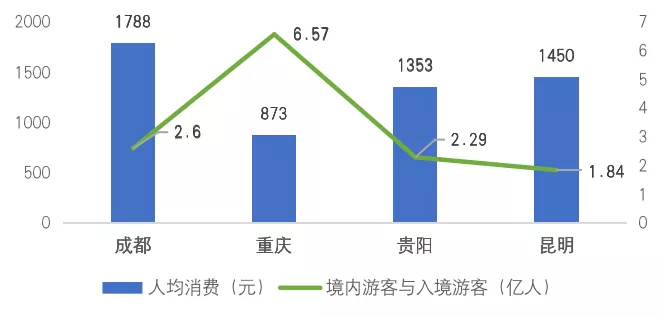 图:2019年西南区域文旅指数TOP4城市人均消费及游客数量