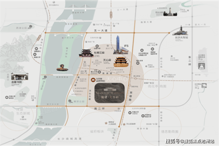 项目落址天心C位,长沙核心二环内,三千年长沙菁华处。历史与当代的交融、生活与商业的繁茂、文脉与精神的承续,丰盛资源云集