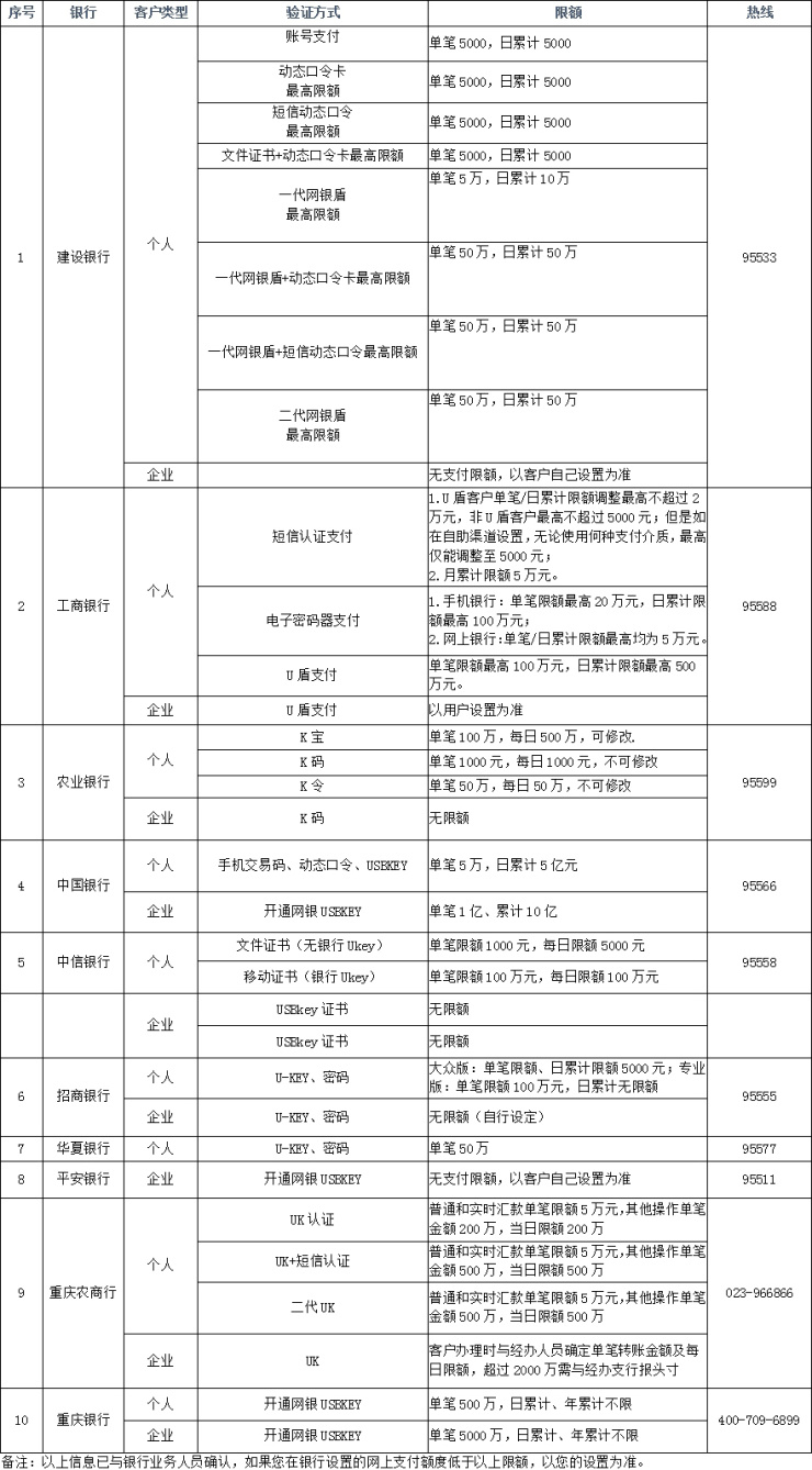 参见下表,如果银行业务发生调整,请以银行的较新要求为准。