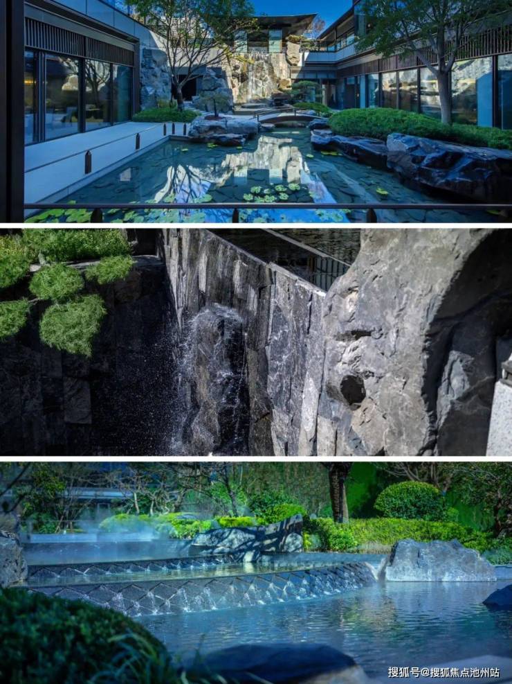 龙鳞片造型的中心水景,堆砌千年风雅。叠瀑倾泻而下,约6米高水瀑鸣中谷,云山叠嶂,再现千里江山图之胜境,那是另一重人生境界。