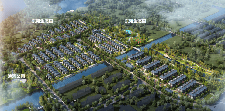 生态资源方面:项目三面皆被生态绿地包围,南侧为瑞慈花园东滩长者社区,东北两面有东滩生态园,西面是滨河公园。
