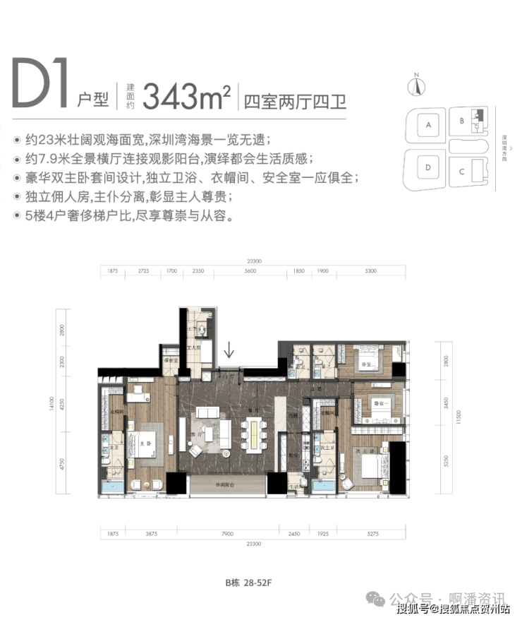 4房户型为340、343平,总价区间为5227 - 7147万/套。东向大户型拥有绝佳视野景观,大开间短进深双面采光,主要生活空间可俯瞰深圳湾海景;餐客厅开间3.9米带有大型观景阳台;三套间双主卧配置,空间宽敞舒适;大型餐厨空间品质上乘,还有独立工人休息间并带有卫浴 。
