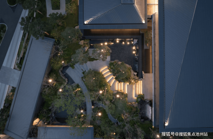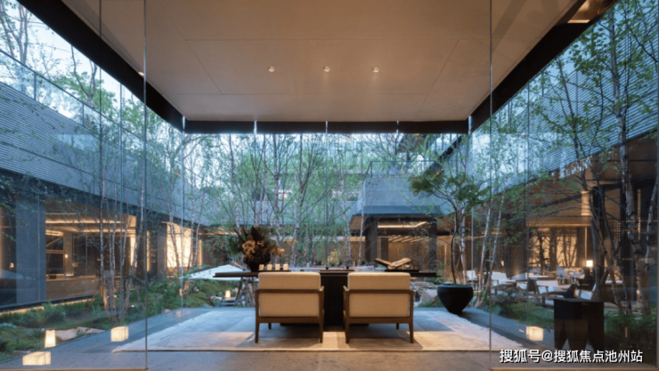 园林景观:承袭千年宋风礼制,以《千里江山图》为蓝本,打造宋风山水庭院,山、石、水、林、瀑、松、径、廊等元素处处彰显宋式美学的轻盈雅致。园区内 18 棵高大挺拔的油松,以及乌桕、红枫等中式意境植物,营造出一步一景的诗意氛围。