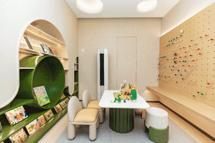 从室外过渡到室内,半岛九号围绕着亲子、运动、社交、健康、学习,在架空层处打造多个主题空间。