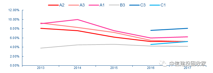 此外,在目前较为紧张的融资环境下,一些银行将资产规模、销售排名与贷款规模相挂钩,导致具有一定规模效益的房企整体融资成本更低。以上述的A1、A2、A3房企为例,随着资产规模和销售规模的快速增长,企业融资成本也迅速下降,一般周转房企B3的融资成本则保持在较为稳定的水平,而低周转房企C1和C3近两年融资成本还有所上升。