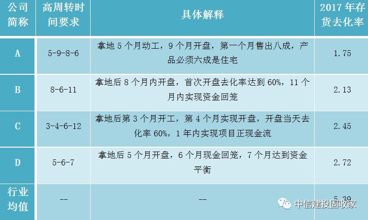 一般来说,“拿地—动工—开盘—资金回笼”构成一个完整现金流周转闭环,而高周转企业力求在每个环节都实现时间的极度压缩。通常情况下,一个项目从拿地到预售大约需要一年半到两年的时间,而高周转房企通常将“拿地—开工”的周期控制在半年之内,“拿地—开盘”控制在一年之内,其中的典型代表高周转房企业则可以在拿地后就5个月实现开盘。