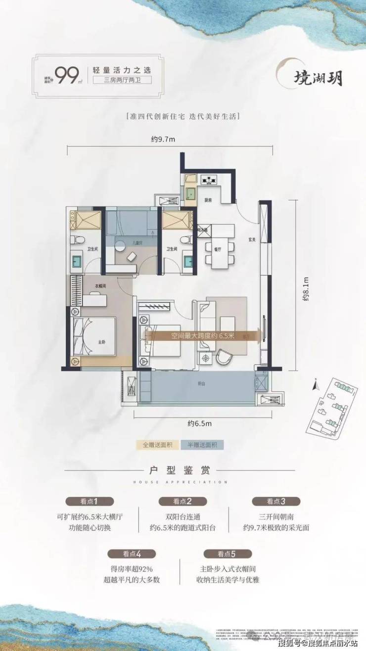 99㎡优化后套内92㎡,得房率93%,南向阳台6.5米;