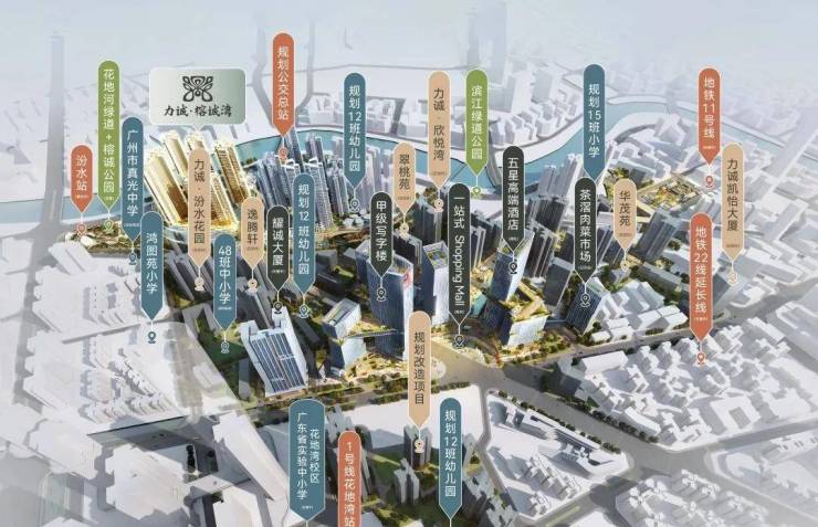 力诚榕诚湾属于茶滘旧改项目,位于荔湾花地河以西,广州香料厂以南地段,北侧有一座高架桥,东邻汾水花园和真光中学,西侧为芳村的花地河。茶滘村改造将分为三期进行,计划用时6~8年。改造后,茶滘村将被打造为荔湾新城,其中包括高层住宅、商业办公楼以及酒店等多种业态。