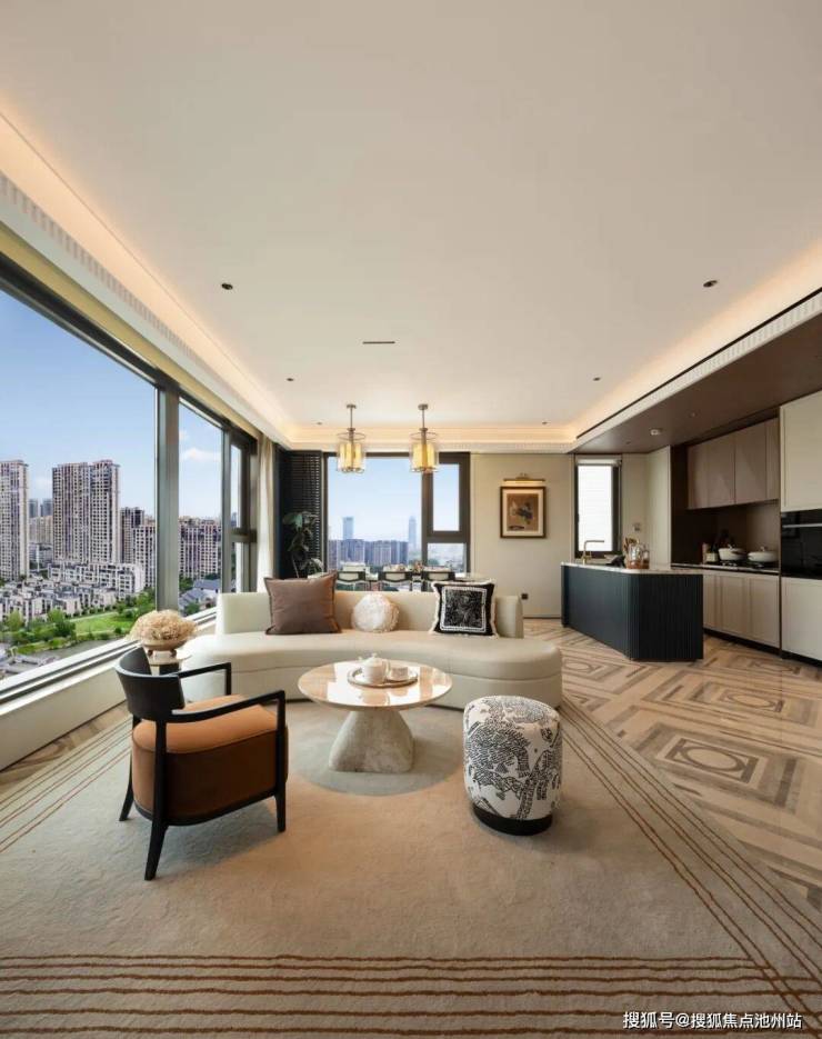 最大亮点在于270全景舱设计,除了南向的阳台、飘窗,西向的一体化餐客厅和北侧的餐厅也做了落地大玻璃,将中庭园林与塘河风光双重景观纳入日常,堪称"品质生活的标杆之作"。