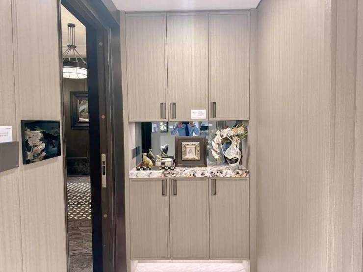 玄关柜台面,选用了雪山飞狐奢石。产地巴西。这种奢石因其独特的美丽和高质量而备受推崇,广泛用于高档家居和商业装饰中。雪山飞狐奢石以其黑白交织的纹理和均匀分布的水晶,为任何空间增添了独特的美学价值。