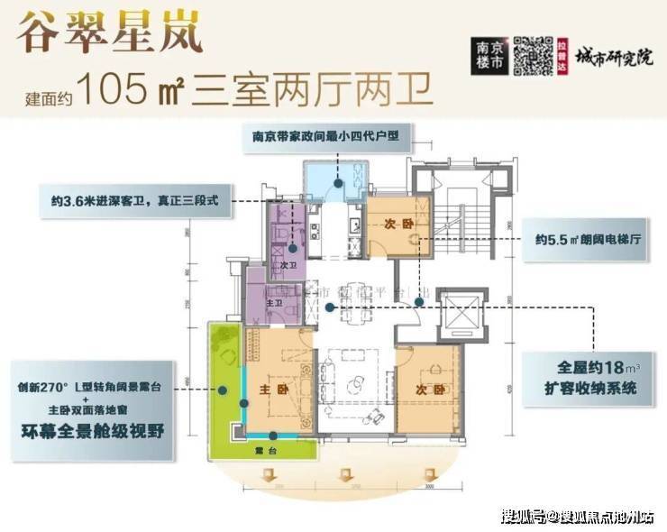 极致产品:105㎡是南京带家政间的最小户型,创新打造270°L型转角露台+主卧双面窗,最高接近100%实用率
