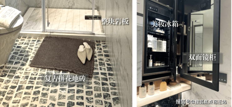 卫生间臻选普拉达绿、雅士白、雪花白、宝格丽紫奢石,纹样大气,品位素颜,展现恒久的气质。同时臻选的海派美学金属镜柜,嵌入美妆冰箱,以精微的细节,演绎矜贵的格调。