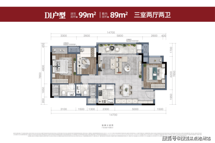 99㎡三居室:户型方正,动静分离,采光充足