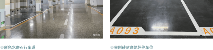 浇筑金刚砂固化剂地坪停车位+彩色水磨石地坪行车道,整个地库打磨如镜子般光亮;耐磨性能、抗冲击性能、抗压性能更强,不易起尘且易清洁。