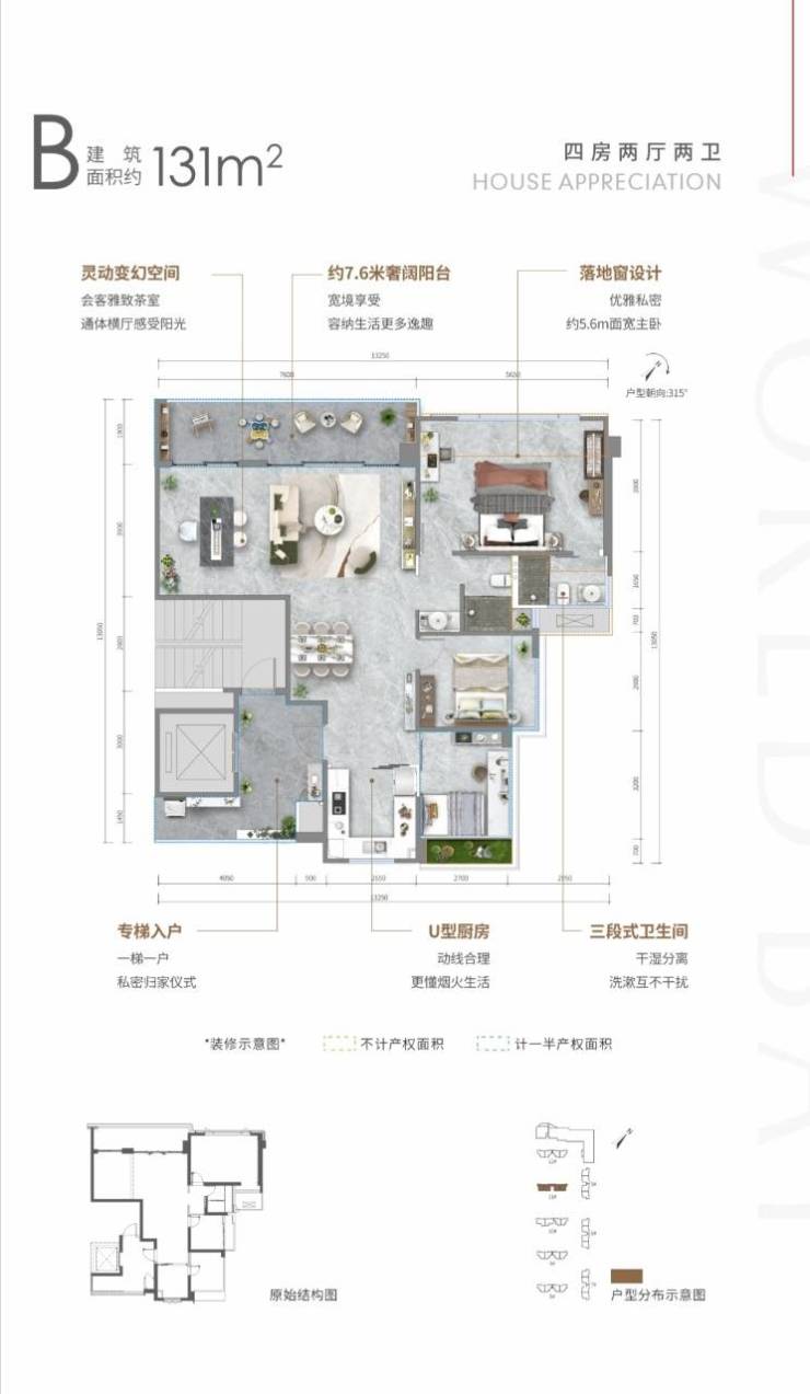 ?B户型: 约131㎡四房两厅两卫、层高23层