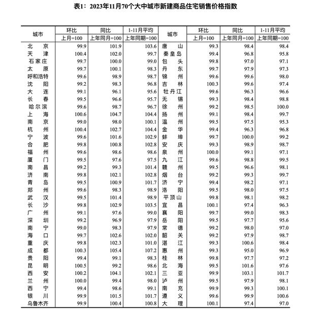 (11月70个大中城市新建商品住宅销售价格指数。图据:国家统计局)
