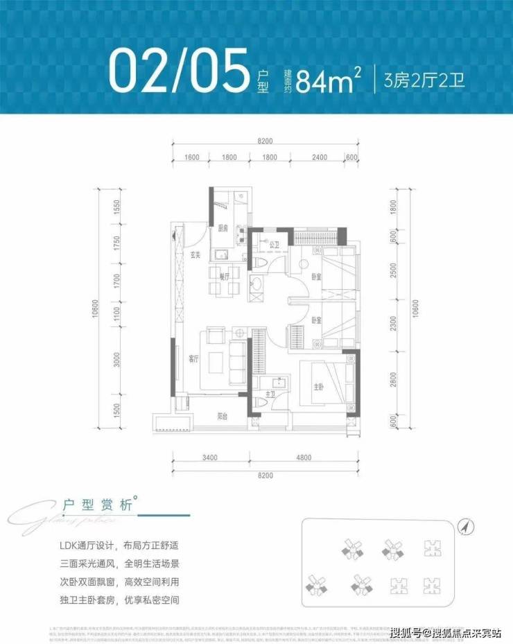传统竖厅格局,动静分区,客厅开间约3.5米,主卧开间约3.2米,两个次卧开间约3米、约2.6米,约6.5米大阳台连接客厅和次卧;03户型西南户型,04户型东南朝向。