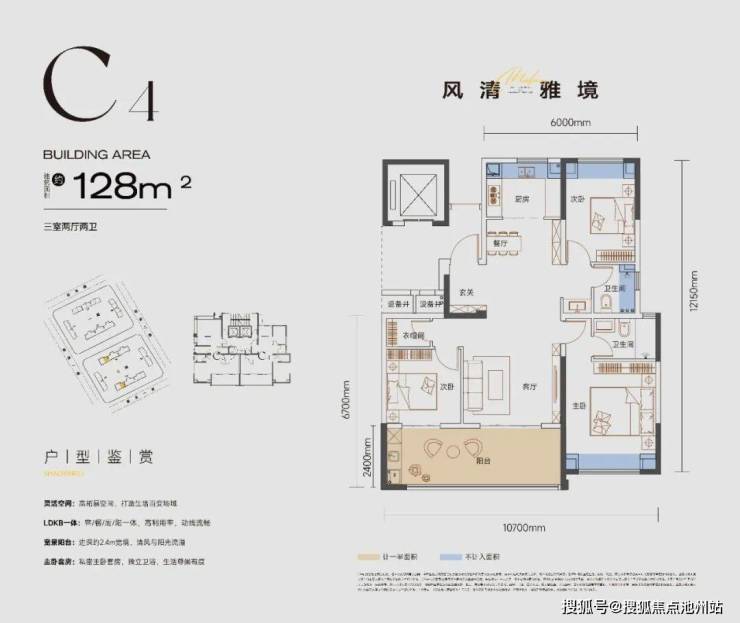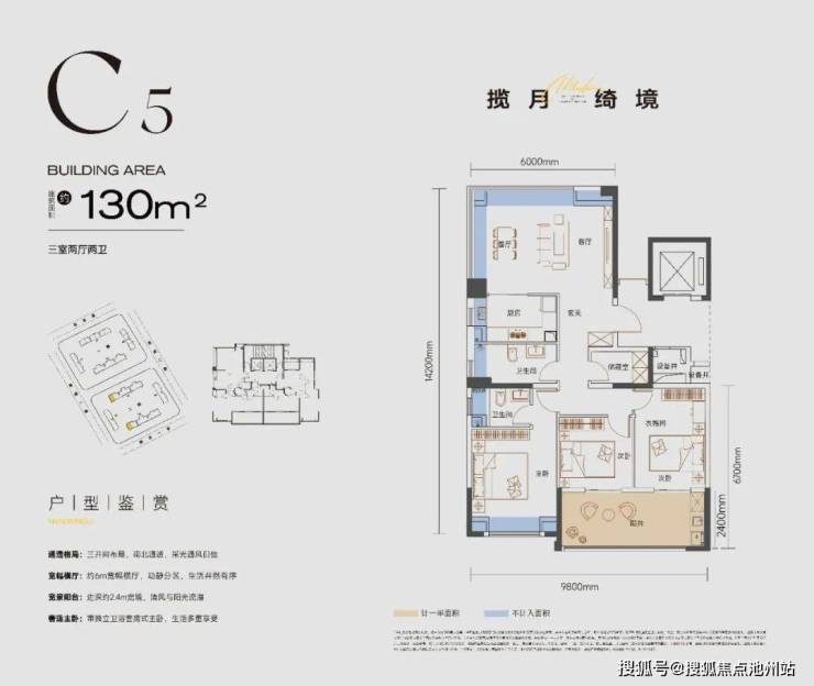 ①122%实际得房率:通过约56平三大露台、2.4米宽大阳台、客厅挑空、飘窗等方式整体赠送面积达到108㎡,得房率122%。