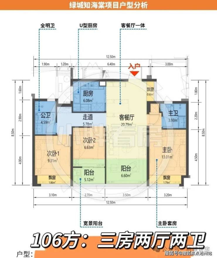 109方户型:三房两厅两卫,独立玄关,横厅边套,生活阳台+休闲阳台(全包),近13米采光
