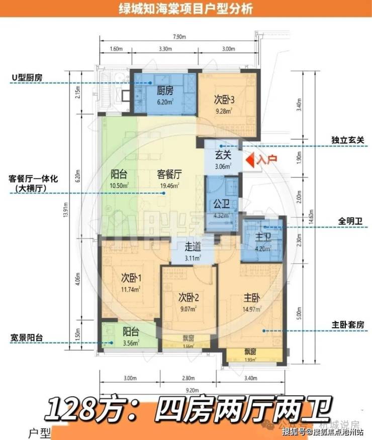 128方户型:四房两厅两卫,独立玄关,横厅边套,三卧朝南,生活阳台+休闲阳台(全包),近16米采光面