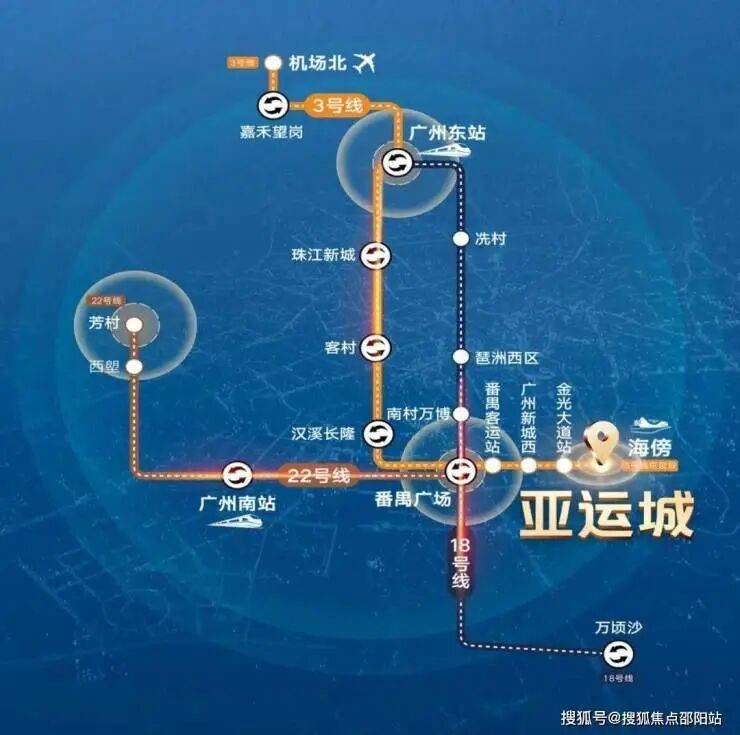番禺广场无缝接驳18号线/22号线执掌番禺2大商务区、速达天河/荔湾CBD3号线始发站1线直达珠江新城,4站达番禺广场TOD接驳18号线5站达南村万博CBD接驳22号线畅达荔湾核心城区