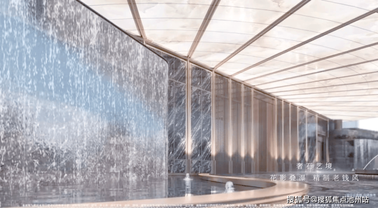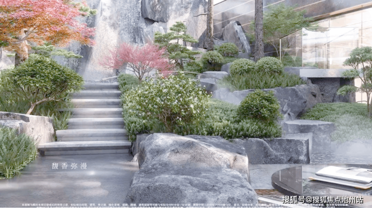绿城·馥香园的山水庭院设计,巧妙融合了山、水、石、树等元素,呈现出一种独特的视觉美感,仿佛将人们带入了一幅生动的青绿山水画卷之中。其中,流水跌瀑的设计尤为引人注目,老皮石模拟的天然崖壁与山石错落叠放,水瀑落下时飞珠溅起,营造出一种“断山疑画障,悬溜泻鸣琴”的诗意氛围。