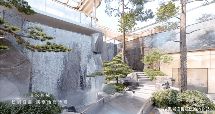 绿城·馥香园的山水庭院设计不仅注重视觉美感,更强调了人与自然的深度互动。设计师巧妙地在崖壁之上布置了两个别致的观景台,分别是横置于山石之上的“月岛”景观平台和傲立于崖壁之巅的“枕云洲”景观亭。通过这些精心设计的空间,未来业主们可以在不同的高度,尽情欣赏那片壮观的瀑布以及整座精致的下沉式庭院。与众多只能静观的下沉庭院不同,这里的每一处景色都充满了互动性,让每一位业主都能尽享山林之美,感受清风拂面、流水潺潺的宁静与变化。