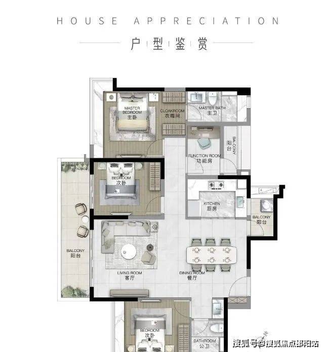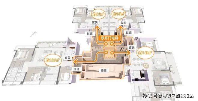 :类专梯入户,两梯四户梯户比搭配双开门电梯,营造豪宅入户体验。豪华主卧套,配备超大 270° 转角飘窗,视野开阔。超大阳台可改房间,且面积赠送一半,极具性价比。三开间南向采光,约 9.8m 大尺度南向采光面,让阳光充分照入室内。超大方厅,动静分明,客厅与卧室分开布置,保证生活的私密性。