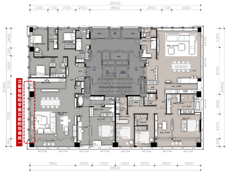 建筑设计:特邀“CREDAWARD地产设计大奖”得主SEA东南担纲设计,结合项目的地块价值和产品迭代的定位,立面采用灰色大面积玻璃幕墙加铝板设计,通过大尺度的窗墙比,营造270°的巨幕景观视野和空间采光体验。
