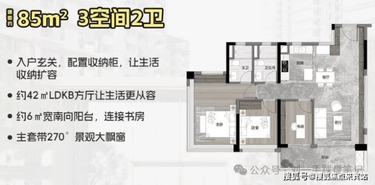 85㎡三房两卫,是72㎡的plus版,阳台连通了次卧,长达约6米,望内部花园