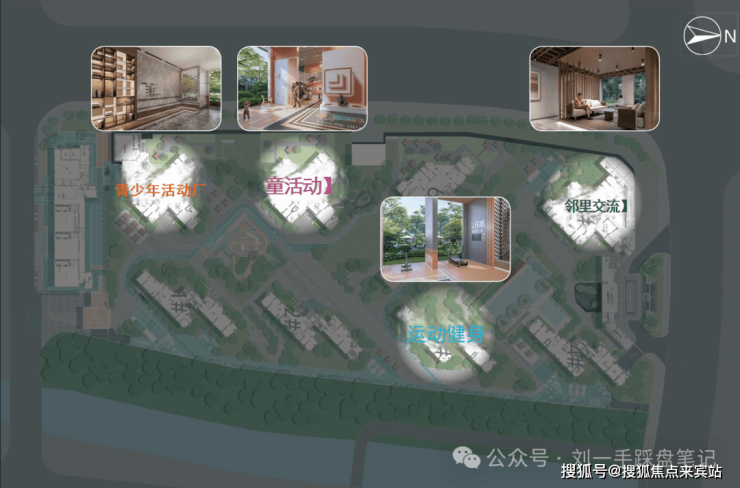 公共空间,包括中央绿岛、儿童FUN享乐园、草坪剧场、有氧跑径、主题架空层等,绿意盎然,老少各得其乐