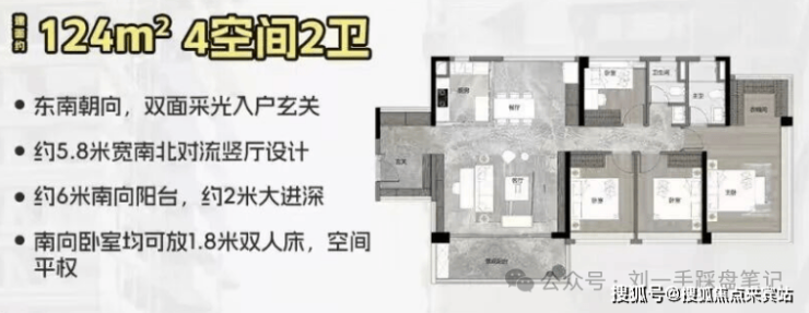 124㎡四房两卫,独立入户花园,南北对流,动静分区,厨房带岛台设计,客厅开间约5.8米连通大景观阳台,南向卧室空间都很大,主卧带衣帽间+270°大飘窗