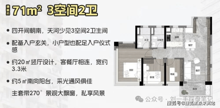71㎡就做到三房两卫,四开间全南向,玄关位置可打造收纳柜,主卧是套房设计,带L型超大飘窗