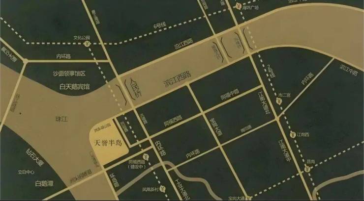 白鹅潭之上,望三江汇聚,仅此天誉半岛。天誉半岛位于海珠区滨江西岛尖位置,项目旁就是洲头咀公园,地处羊城八景之一的白鹅潭板块,西、北两面临江,西侧江边为滨江绿化带,北望白鹅潭、沙面。