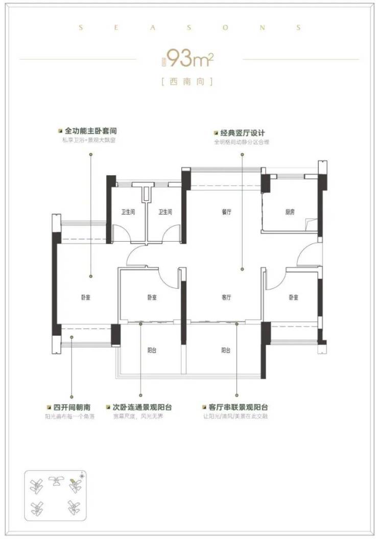 具体来看,建面约 92-93㎡户型亮点突出。四开间朝南且南北对流,全功能主卧套间保障私密舒适,景观大飘窗便于观景。其超大阳台尺寸远超同面积户型,为空间扩展预留充足余地。