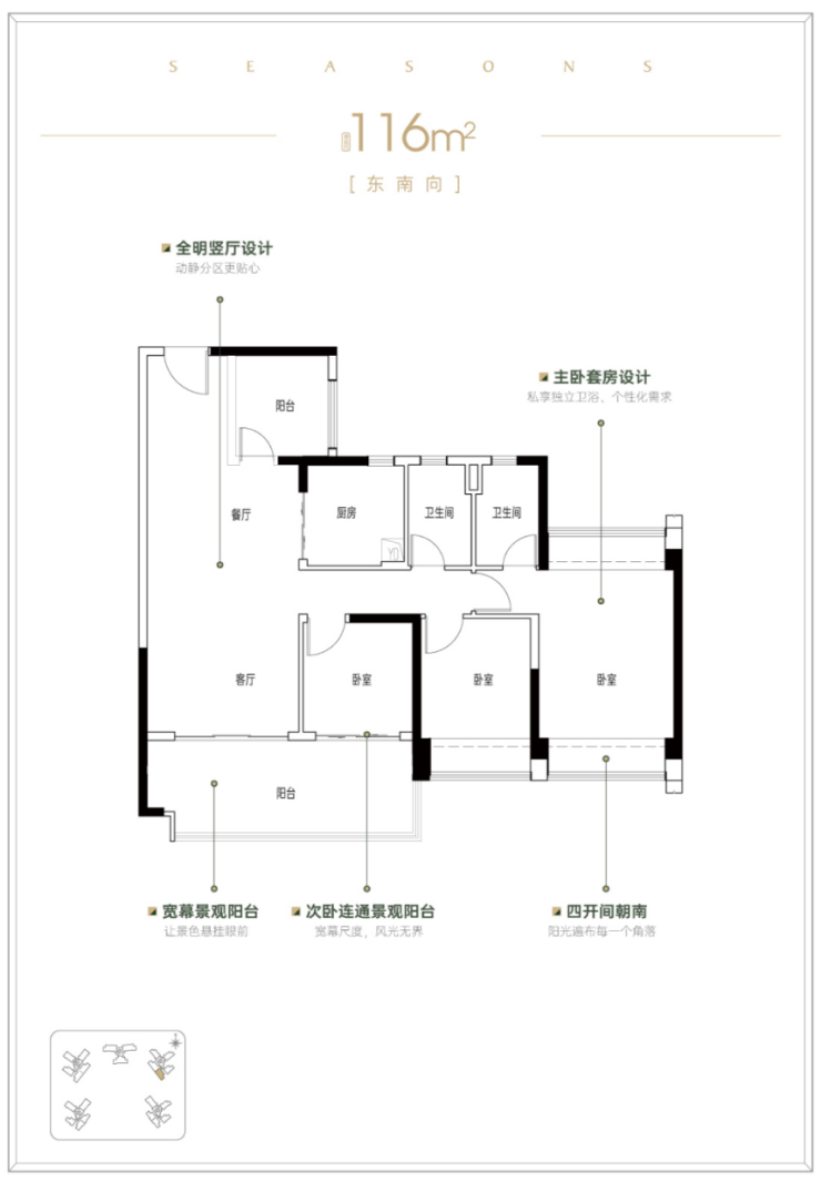 建面约 116㎡户型采用经典竖厅设计,打造 3+1 房带主套格局,同样四开间朝南。次卧连通景观阳台增强空间延展性,飘窗两侧设置的独特设计,优化通风效果。玄关左侧阳台可改造为书房,满足多元家庭需求。