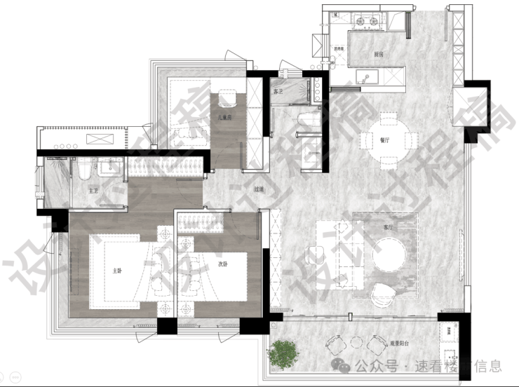 建面168平四房三卫,放大版的142平,做了双主套,适合三代同堂家庭,单边位,南北对流采光通风都非常好,约40平的大房厅,景观阳台开间约8.2米.