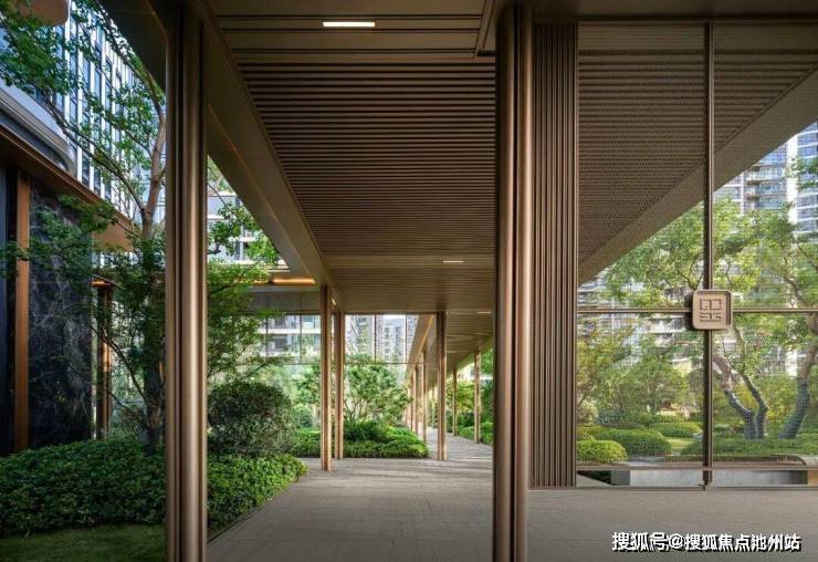 超越物理空间的奢华,家的真谛更在于日常相处的温度。约500米的风雨连廊如同社区的“第二客厅”,将各栋楼宇与中心园林无缝串联,让业主无论晴雨皆可从容漫步。在连廊的每一个转折、交汇处,我们都摒弃了生硬的直角,同时部分区域精心设计下挂金属屏风、让漫步氤氲着“宋式垂帘的东方意境”。