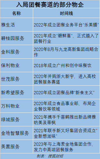 不止新希望服务,据搜狐财经不完全统计,已有碧桂园服务、新城悦服务、雅生活、保利物业、远洋服务、特发服务、星盛商业、世茂服务、绿城服务、金地智慧服务、金科服务、美置服务等超13家物企布局团餐赛道。