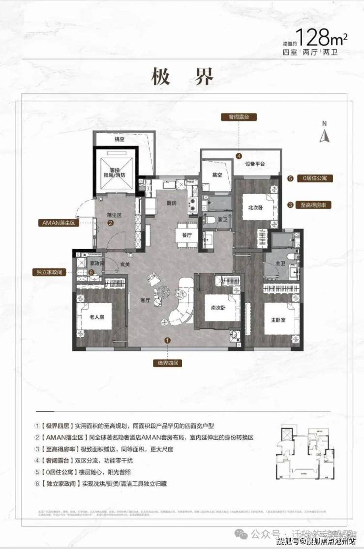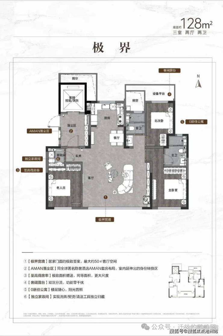 3.双分区露台革命 :通过设备平台改造(5㎡不计容)与挑空露台赠送,实现功能分置。以128㎡户型为例,东侧设备平台可改北阳台,左侧露台适配观星台/画室等场景,形成“双舞台”生活场域。
