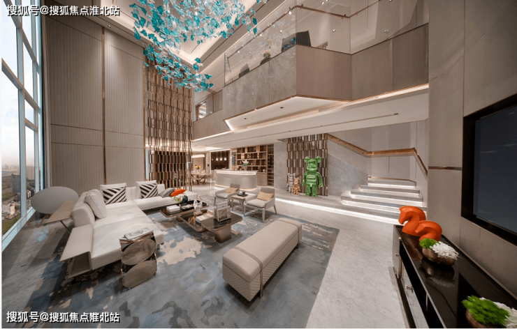 当然,整套房子的焦点,一定是那个8.85米宽的超大客厅。配上7.3米的无敌挑高,一整面墙的大落地窗,还有360°环绕的沙发组,