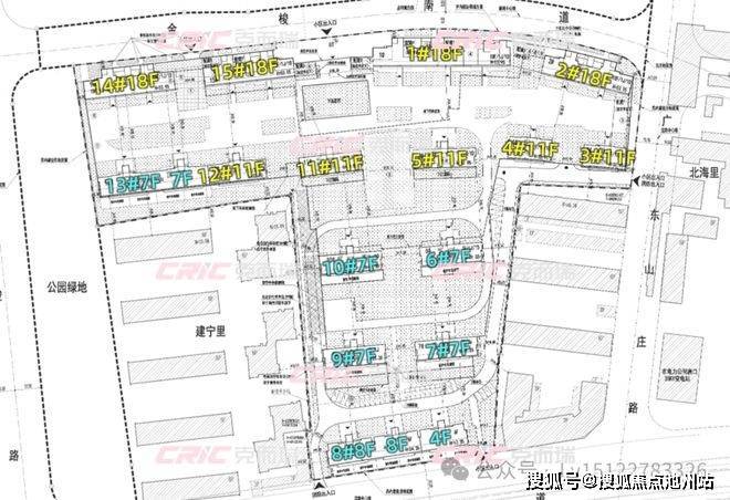 共15栋住宅楼,其中5栋为11F到顶的小高层,4栋为18F到顶小高层,5栋为7F到顶的洋房,1栋为8+4F到顶的洋房