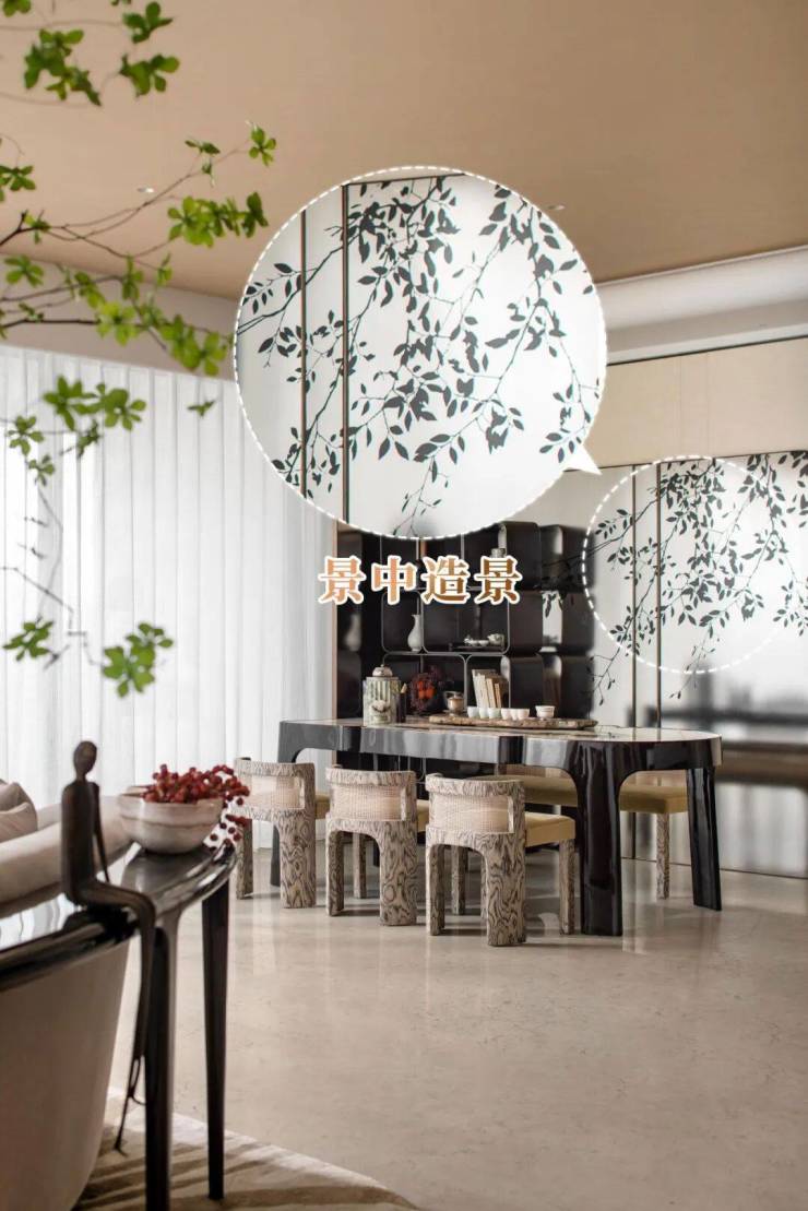 还有客厅茶台,更做到了“景中造景”,借助花瓶、竹子等元素融入宋式美学。