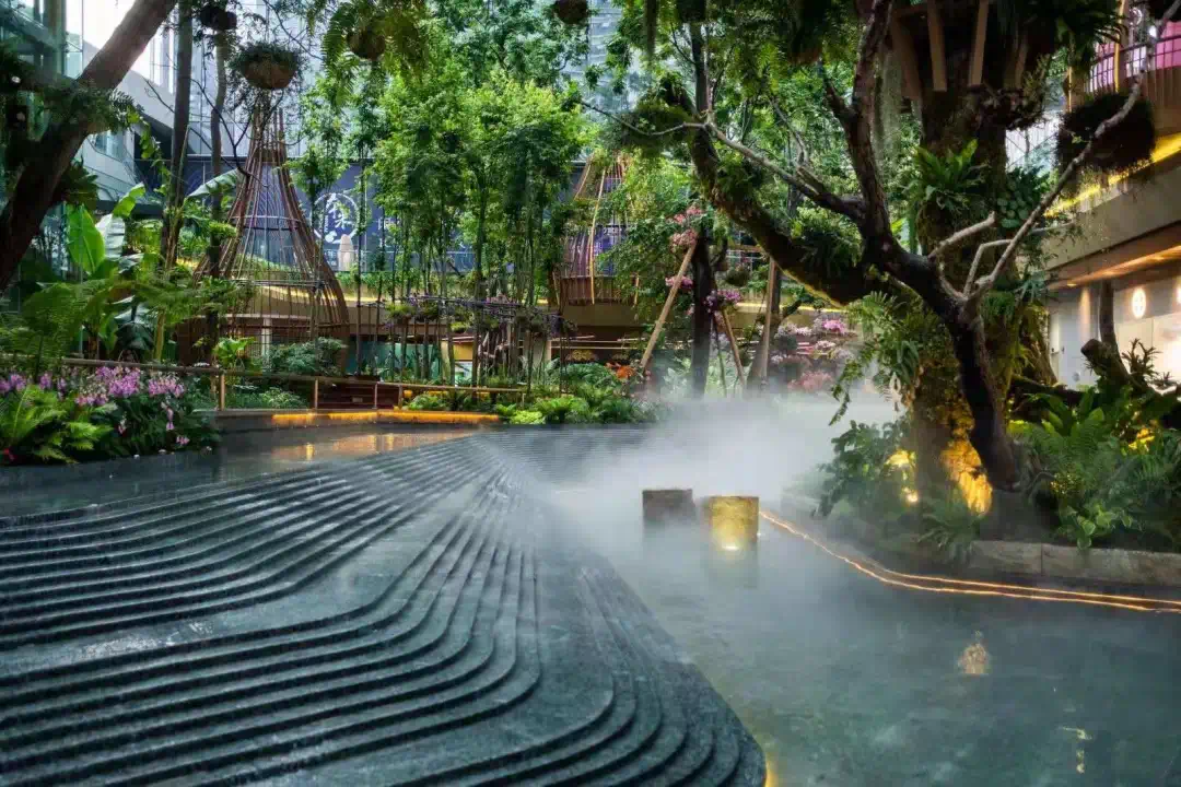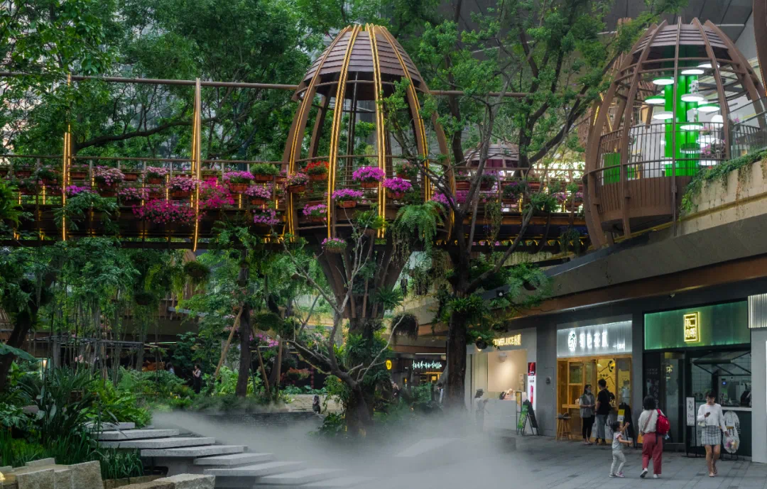 下沉式园林广场位于入口处的飞碟之下,构成整个项目的主体,走进去仿佛进入了热带雨林。“公园+”购物中心设计氛围成都港汇天地打造自然有氧的“公园+”购物中心设计氛围,并将“公园+”的设计理念与品质消费相互结合,带来了丛林走廊、绿林镜湖、林间树屋等立体式园林生态景观,营造年轻活力的氛围、打造自然有氧的环境,让自然和繁华交融,生态与艺术兼得,以差异化打造不同感观、不同体验的一站式购物天地。