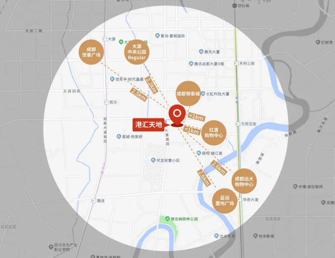 提起“天府之国”成都的商业,太古里项目大概已然人人皆知。那今儿个,咱们来聊聊成都另一个“深藏不露”的项目港汇天地。港汇天地落位东至吉泰路,南至伏龙北巷,西临益州大道,北临天府五街。周边覆盖阿里巴巴、腾讯、亚马逊为代表的区域头部大型企业,天府软件园、菁蓉国际广场为代表的产业园区等各类型优质商务资源;1.5km的辐射范围内,还贯穿益州大道“住商分离”线,连接了大量住宅小区
