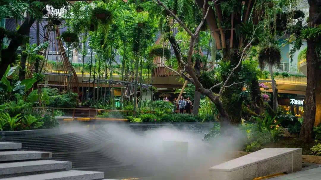 大量水动线的贯穿是整个项目的特色之一,其下沉式广场部分巧妙地利用高低差打造出“梯田式”的生态溪流,并形成烟雾缭绕的镜湖。