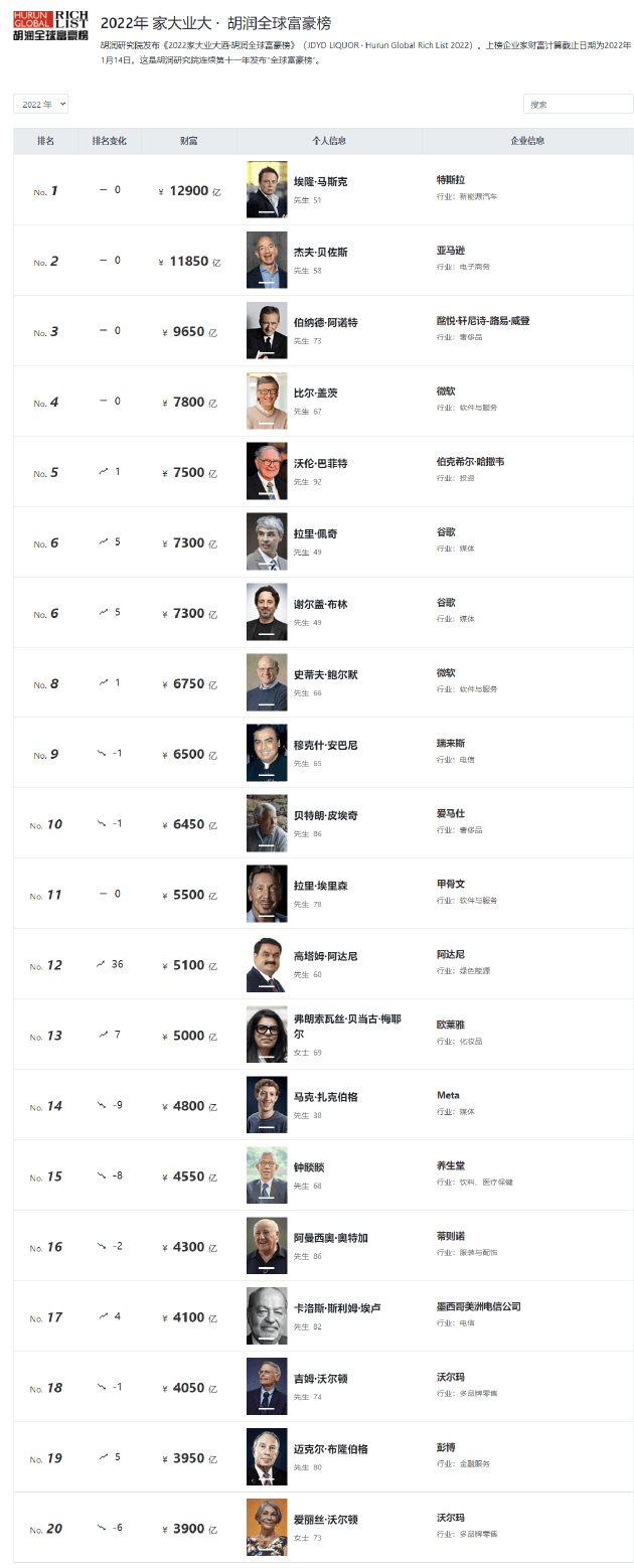 2022胡润全球富豪榜:马斯克蝉联世界首富,钟睒睒稳拿中国首富